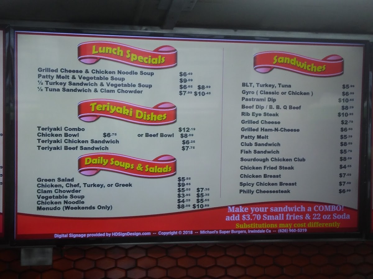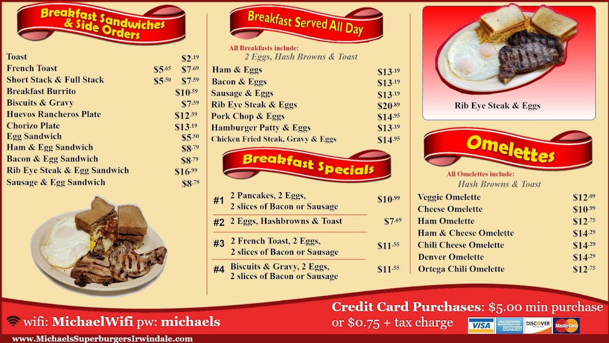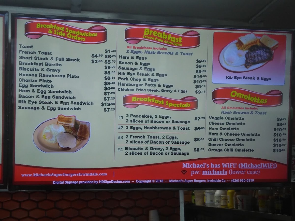 Welcome to Michael's Super Burgers Irwindale, a standout in fast food located at 16350 Arrow Hwy, Irwindale, CA. Known for its vibrant menu, this restaurant serves an impressive array of offerings tailored for everyone, from breakfast enthusiasts to late-night snackers.